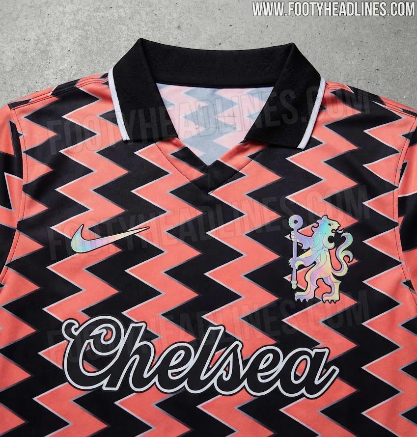 耐克一反传统,没有采用切尔西俱乐部的官方徽章,而是使用了狮子图案。耐克标志和狮子图案都采用了虹彩效果,随着光线变化呈现出闪烁变幻的色彩。另一个引人注目的细节是赞助商区域,传统的赞助商标志被“Chelsea”字样取代,采用经典流畅的字体书写,强化了球衣的复古风格。