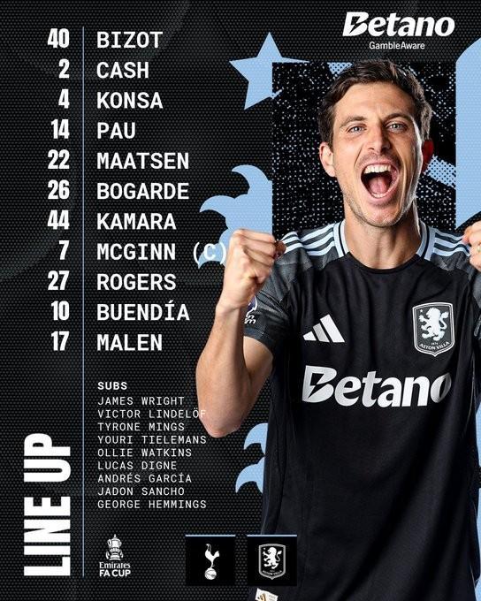 维拉首发:40-比佐、22-马特森、2-卡什、4-孔萨、14-保-托雷斯、26-博加德、27-摩根-罗杰斯、44-卡马拉、10-布恩迪亚、7-麦金、17-马伦