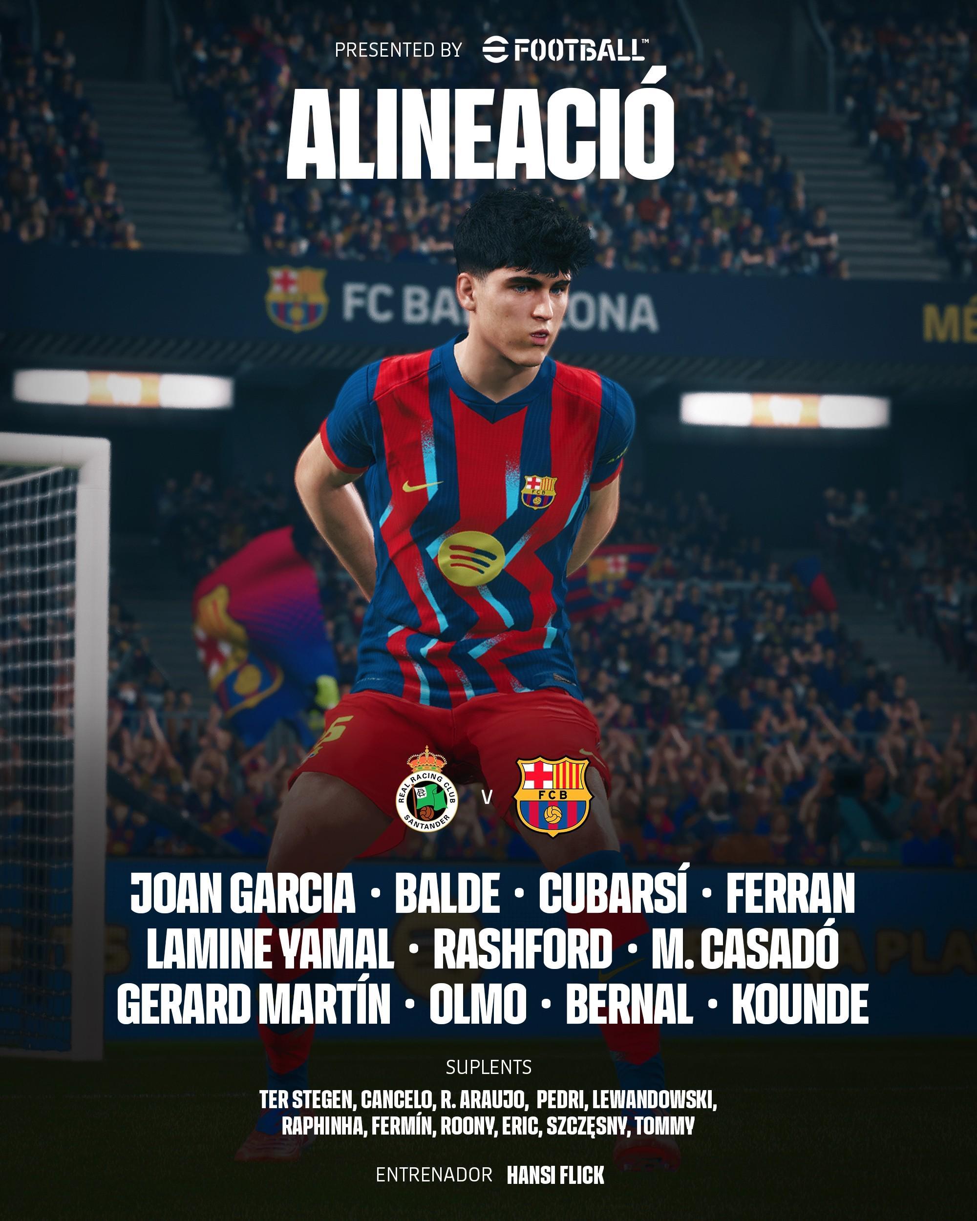 巴萨首发:13-霍安-加西亚、3-巴尔德、5-库巴西、18-赫拉德-马丁、23-孔德、22-贝尔纳尔、17-卡萨多、20-奥尔莫、10-亚马尔、14-拉什福德、7-费兰-托雷斯